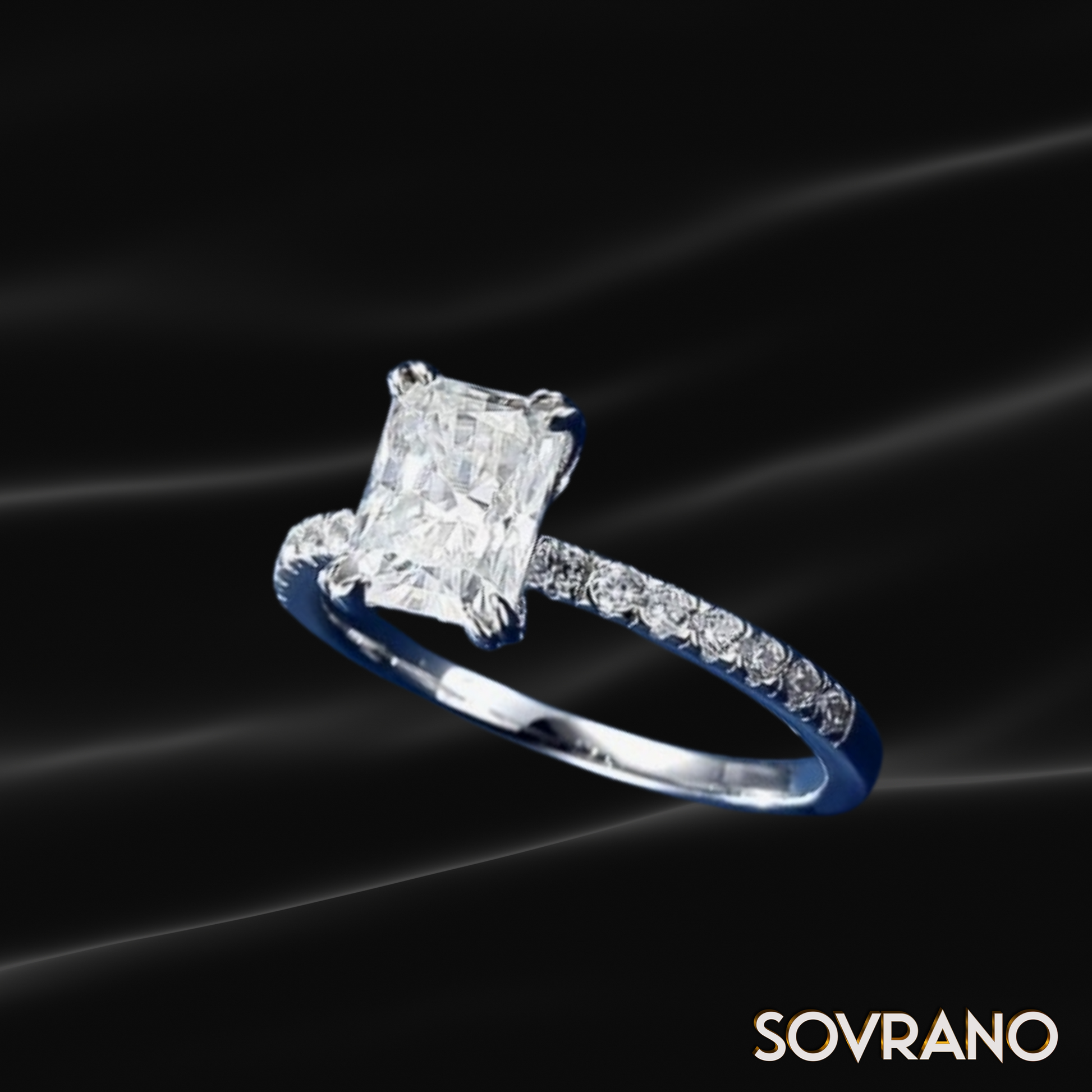 This exquisite side-stone engagement ring showcases a radiant-cut, D Color, VVS1 Clarity lab-created moissanite center stone, securely set in elegant double claws. Crafted in solid S925 sterling silver and finished with luxurious 14K white gold vermeil, the band is adorned with a row of brilliant pave-set accent stones, adding exceptional sparkle and sophistication.