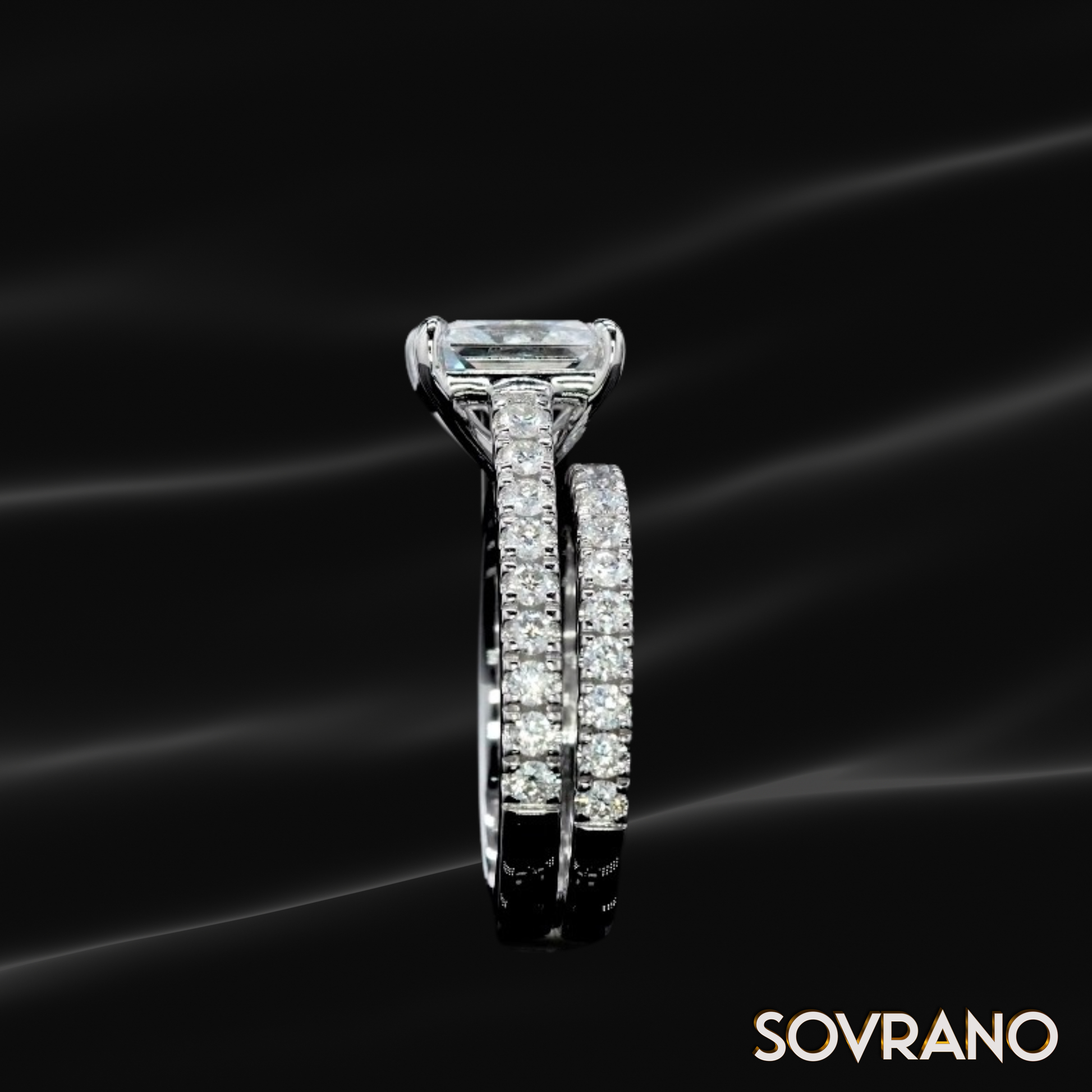 The radiant-cut design combines the clean geometry of an emerald cut with the dazzling sparkle of a round cut—perfect for women who embrace bold sophistication and timeless glamour. Each band is intricately lined with premium moissanites, creating a seamless halo of brilliance that enhances the center stone’s glow.